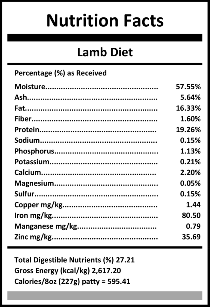 Ingredients:Â Finely ground whole lamb: meat, bones, heart, kidney, liver.