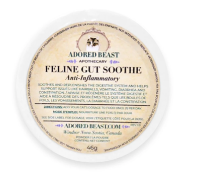 Feline Gut Soothe by Adored Beast replenishes and soothes the lining of the bowel, combats unhealthy bacteria with 15 billion cfu 14 species probiotic and helps supports issues such as hairballs, vomiting, diarrhea, sneezing, bladder issues and constipation.