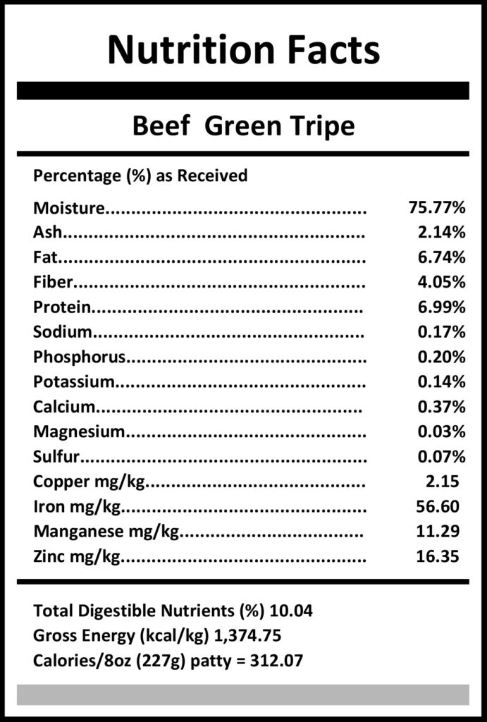 Benefits: Carnivora Beef Tripe is a source of digestive enzymes, natural probiotics and amino acids which together aid in digestion, cleanse and purify the blood, create a balanced microflora in the tummy, boost the immune system, keep the teeth strong and many more highly beneficial positive outcomes. Tripe has the desirable calcium to phosphorus ratio or 1:1. The PH in this Green tripe is acidic with a protein average of 18%, and approx. 12% fat. Carnivora beef tripe is also a natural source of Omega-3 & Omega-6 fatty acids! Each patty consists of the entire second stomach of the cow, with gastric juices, amino acids, and digestive enzymes!