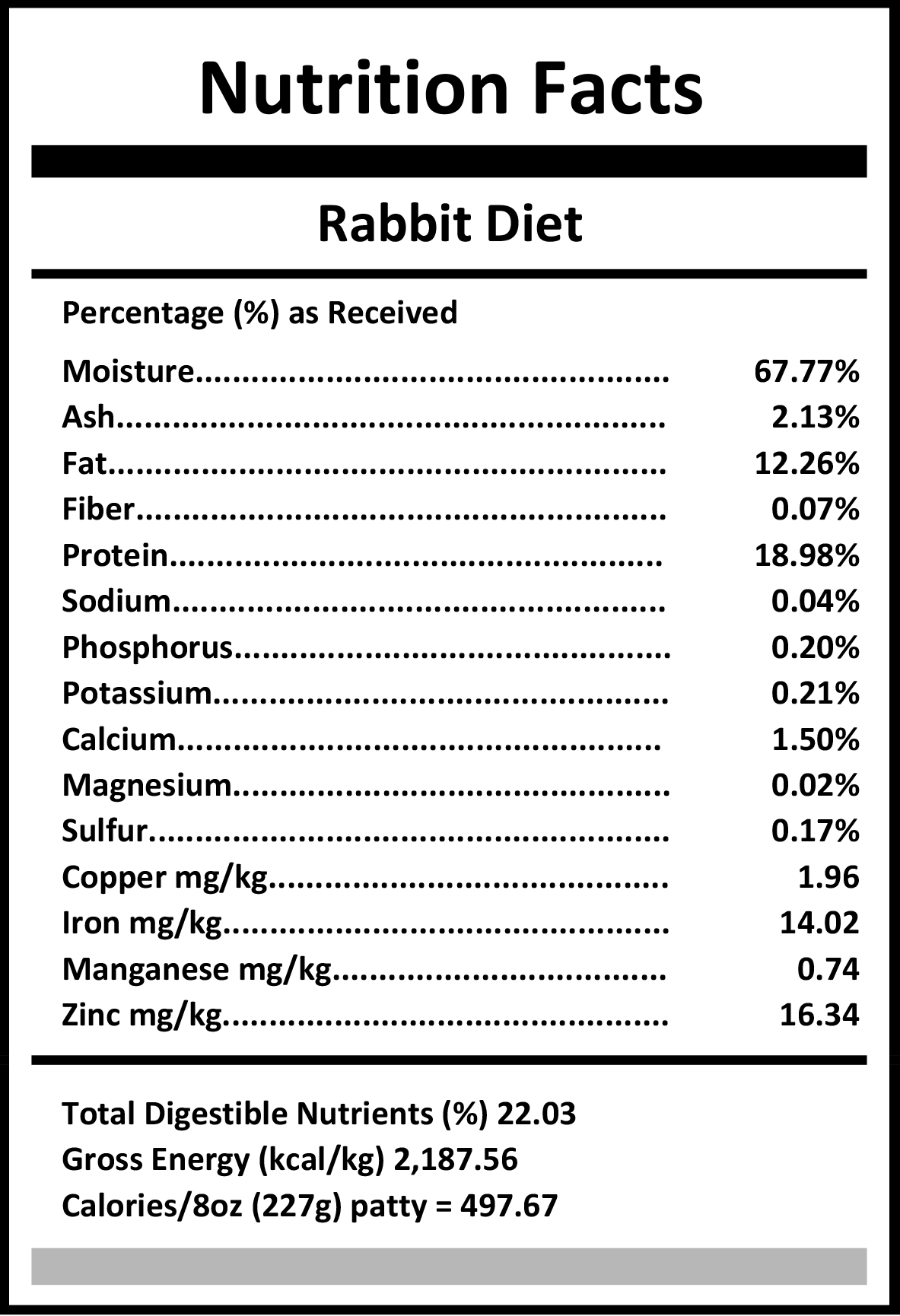 Ingredients: Finely ground whole rabbit: meat, bones, heart, kidney, liver.
